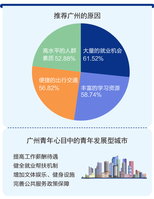 调查显示,青年对广州整体满意度较高,平均综合得分为4.21分,其中,青年对广州城市形象的满意度评价最高,得分为4.45分。82.28%的受访青年表示未来愿意继续留在广州发展,31.51%的受访青年表示会积极向亲友推荐广州。其主要原因为大量的就业机会(61.52%)、丰富的学习资源(58.74%)、便捷的交通资源(56.82%)和高水平的人群素质(52.88%)。