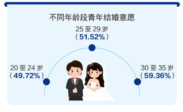 调查结果显示,广州青年整体呈现出明显的晚婚趋势,但结婚仍然是绝大多数青年的选择。随着年龄的增长,广州青年选择结婚比例显著增加。