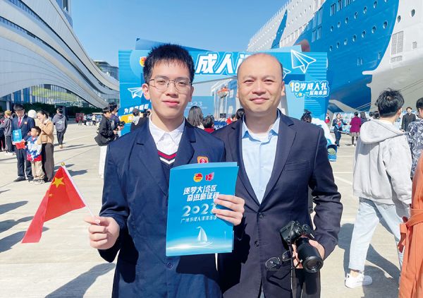2023年成人宣誓当天,在千帆竞发的南沙邮轮母港,阳光透过薄薄的云层,照耀着我们稚嫩的脸庞,和风拂面增添了几分凉爽。李大钊先生“以青春之我,创建青春之家庭,青春之国家,青春之民族,青春之人类,青春之地球,青春之宇宙”的声音在我们心中回荡。