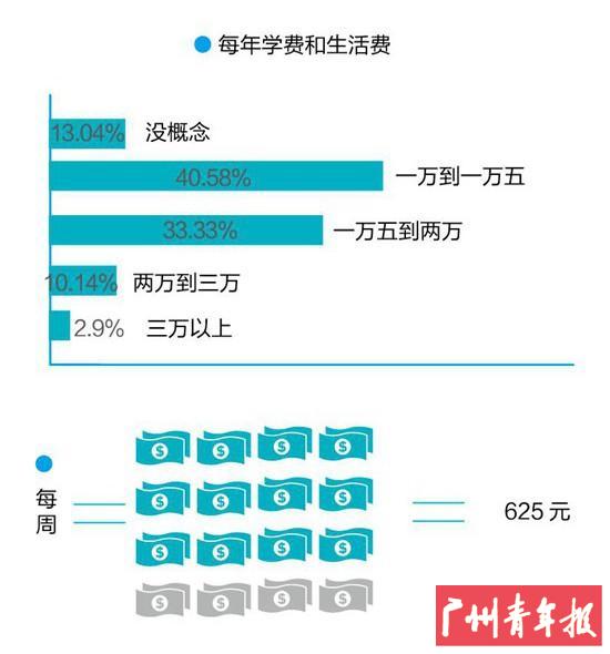 调查结果显示,包揽学费、生活费等支出,73%的大学生每年的支出在一万到两万之间,10.14表示自己花费在两万到三万,还有3%表示自己花费三万以上。