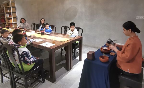 温杯、投茶、洗茶、斟茶……围坐于木桌旁,小记者们近距离感受了一番岭南茶文化,现场观摩了茶艺师演示潮汕工夫茶二十一式的传统沏茶技艺。看似简单的沏茶动作,也包含着对茶叶投放量的掌控、对水温的把握等技巧,在满室茶香中,小记者们静下心来“品尝”茶文化中蕴含的古韵古礼。