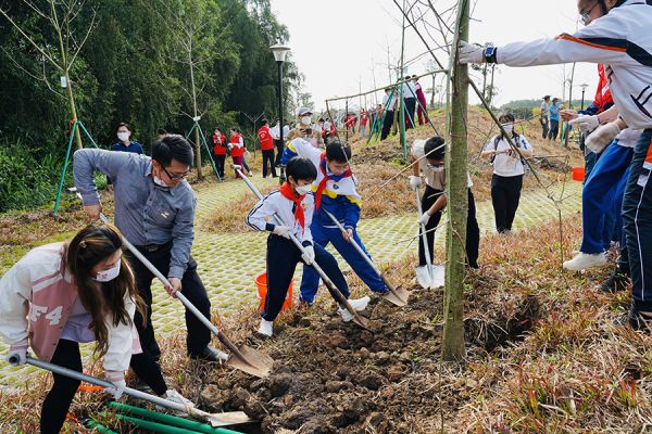 2月13日,南沙湿地公园热闹非凡,植苗、培土、围堰、加固、浇水,300余名青少年们挥汗如雨,在“青年林”牌匾旁携手种下树苗。青少年们乘着义务植树活动的春风,在大好春光中共植一抹青绿。广州青少年投身“爱绿、植绿、护绿”的队伍中,守护好岭南的绿水青山,用行动践行“绿美广州”的倡议。
