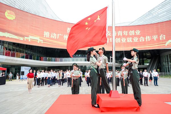 9月22日,粤港澳三地青少年代表在粤港澳青少年交流活动总部基地旁参与升旗仪式,全场青年高声齐唱国歌,穗港澳青少年护旗手在歌声中飘扬起五星红旗,共融湾区发展,共叙家国情怀。