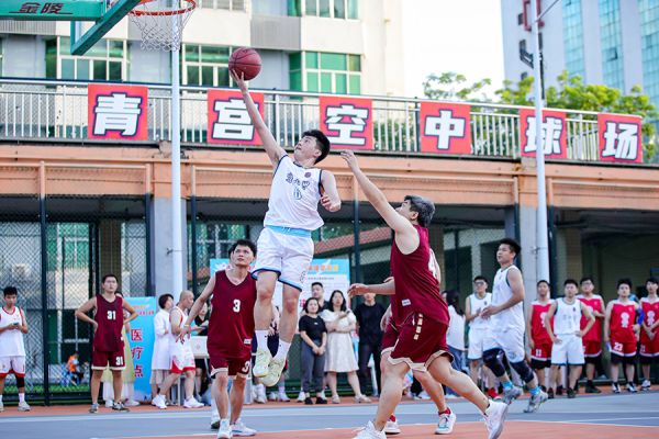 全民健身日当天,市青年宫开展北京街青年篮球交流赛。青年运动员持球突破对方防守队员,高高跃起,自信满满举手得分。