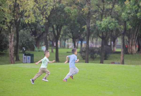 两名小男孩在广州市儿童公园绿地草坪欢快地撒欢、奔跑、嬉戏,全身心接触自然,融入自然,尽显童心童趣与“绿美广州”互动交融。