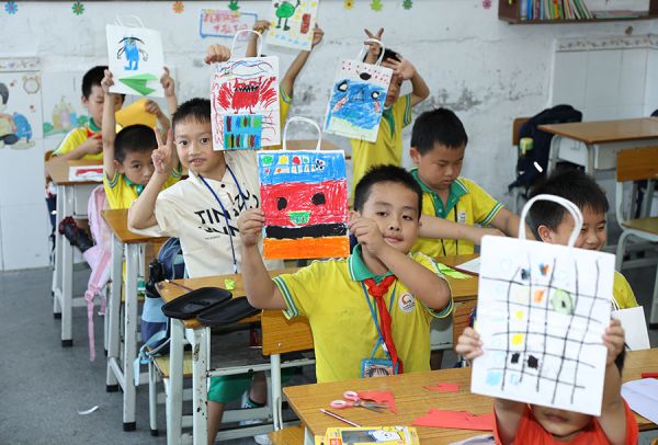 市少年宫选派“星光计划”老师服务乡村学校少年儿童健康成长,同学们在老师的教导下自豪地举起自己绘画的“大作”,通过绘画的方式认识情绪,学会如何管理“情绪小怪兽”。