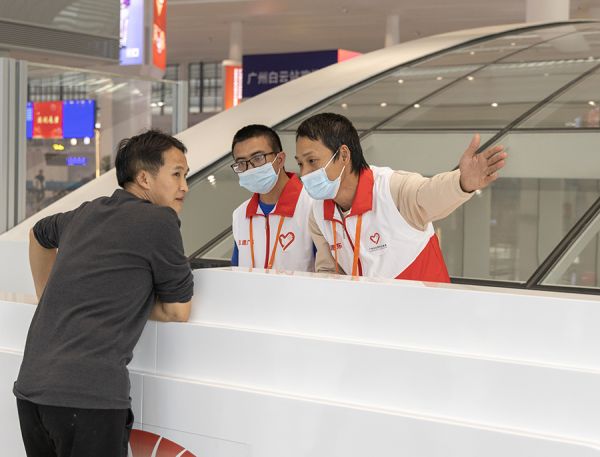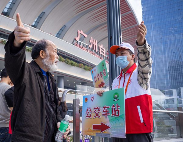 一位老者刚到广州白云站,不懂使用智能手机导航,向志愿者问路,志愿者不厌其烦向老者指路说明 余兴东/摄