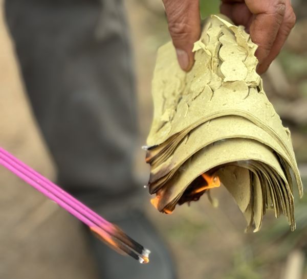 猪头肉在老人的口中被称为“财头”,寓意着丰盛和富饶。卤了三个小时的猪头肉被端上小方桌,一旁是整块豆腐,豆腐上插着一双筷子,再倒上白酒。点燃香纸,将杯中的酒洒在地上,手拿红香,作揖四方,神情虔诚。随后将红香插在地上,先祖的灵魂也循着火光,找到了回家的路。