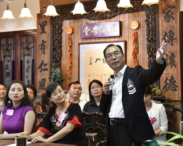 吴铭枝(右)在“兔爸学堂”向家长们分享家庭教育经验