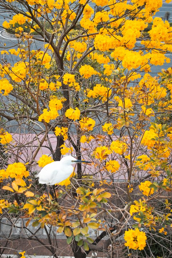 连白鹭也停留在黄花风铃木上栖息 黎继常/摄