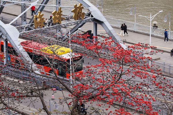 海珠桥头的木棉树枝头开满了绽放的木棉花 袁彬/摄