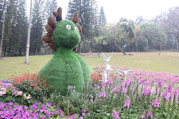 白云山的树林花丛围绕着可爱的“草皮”公仔 陈昊/摄