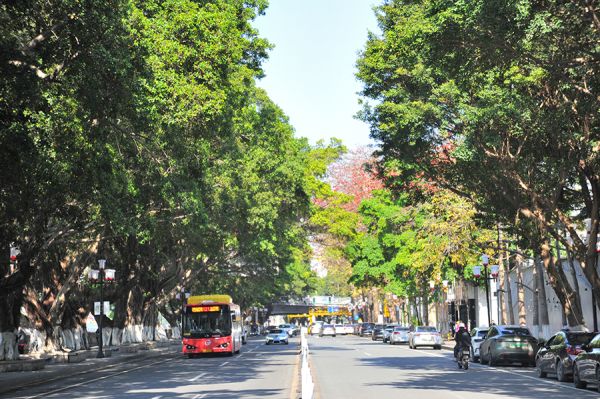 海珠区滨江西路,鲜艳的红棉和翠绿的榕树相互映衬,形成一条具有广州岭南特色的林荫路 吴启光/摄