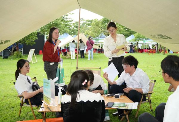 活动现场,露营招聘区热闹非凡。同学们带着精心准备的简历前来投递,企业代表热情洋溢地向同学介绍岗位内容。据统计,本次活动累计吸引来自广州大学城各大高校的近500名青年大学生参会,收到求职简历约320份。