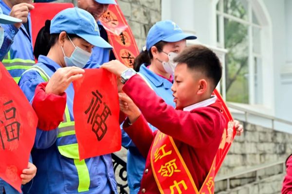 黄埔区少工委联合区文冲街道少工委开展“红领巾爱广州 致敬新春坚 守的您” ——广州市黄埔区少先队校外主题实践活动。少先队员代表亲切地慰问了环卫工人代表,并为他们送上亲手写的“福”字,表达对城市美容师的感激与祝福。