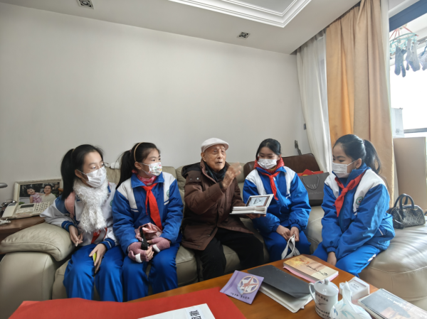 ●广州市真光中学附属培真小学的少先队员代表来到95岁高龄的杨永洪老爷爷家,听杨爷爷讲述在广州儿童剧团中参加抗日工作的故事。