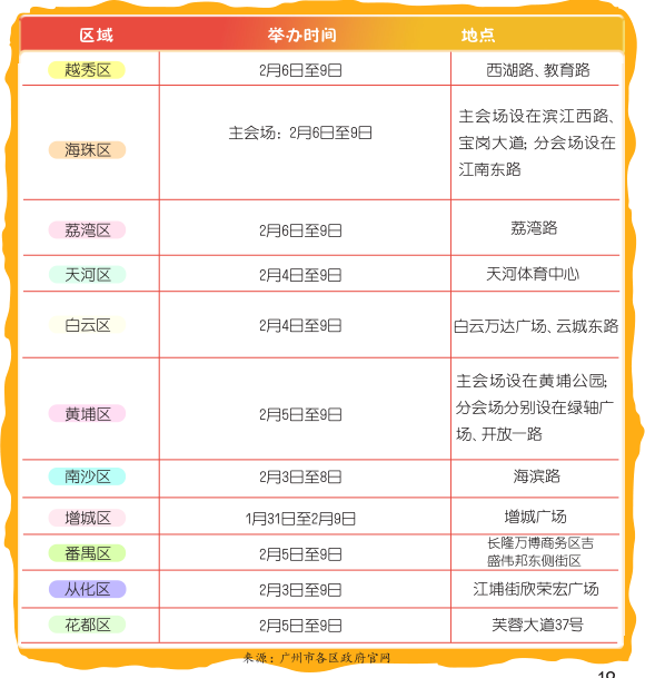 2024年广州迎春花市将在全市11个区,按照“一区一花市”模式集中举办,并且,为响应市民群众的呼声,各区的花市都会相应延长举办时间和扩大规模。同学们是不是特别想知道,各区的花市究竟会在哪里举办呢?
