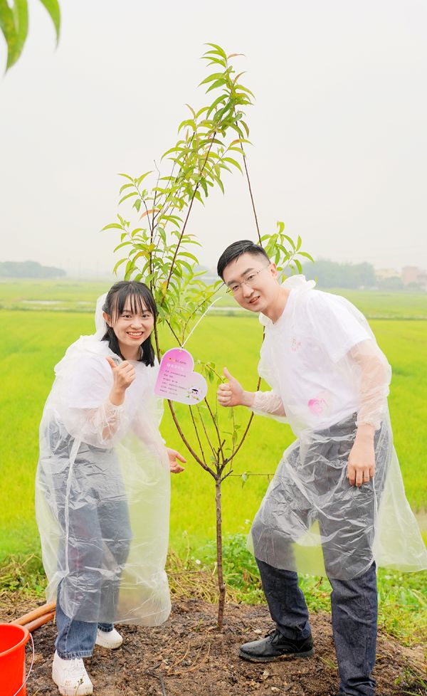一对新人挥锹铲土,种下寓意爱情永久的桃树