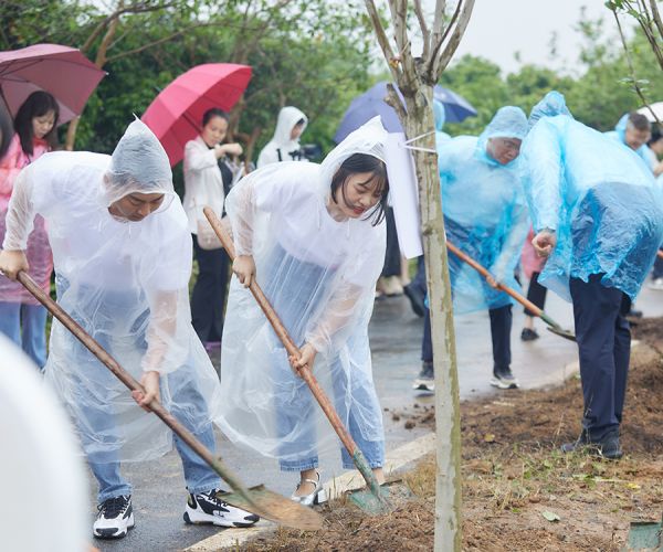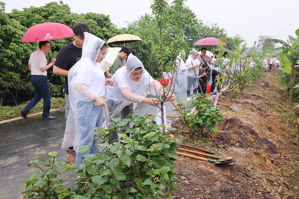 集体婚礼仪式结束后,主办方嘉宾与新人代表共同启动从化首期幸福同心林。新人们冒着小雨挖坑、培土、浇水,种下了一棵棵茁壮成长的小树苗,携手挂上带有新人们姓名的树牌。