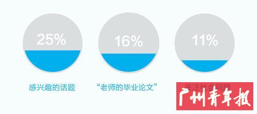 在调查中发现,超过一半的学生更关心跟自己专业相关的,28%的人则会以自己感兴趣的话题为关注点,而不少学生正处于实习阶段,所以选择跟实习相关的论题也不在少数。那有多少人是在写“老师的毕业论文”,16%的学生选择听命于老师指定的题目。但关注当下社会性问题的更少,占11%。