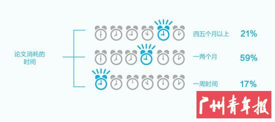 从选题报告、开稿、前言到最后成稿,每个环节都会经历不停的卡壳中,说起什么时候开始准备毕业论文,接近60%的人是在要交开题报告的前一周才真正动手,从去年10月份开始构思的就占了35%,剩余的则是火烧到屁股了,赶在交开题报告的前一晚才开写。一旦开始接触毕业论文,就会患上“一拖再拖”的重症,所以在这场拉锯战中,大多数人还是消耗的时间不会太长,只有21%在论文上花了四五个月以上,59%的人用了大概一两个月,有12%的人是交初稿前一周的时间内写完。而且论文的完成往往一蹴而就,一半以上的学生都是改了三到五稿,还有不少的人只改过两稿,一稿就过的也占了17%,只有极个别是在五稿以上。