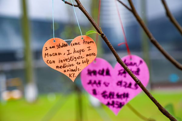 “我希望将来能考上 心仪的中国科技大学。”“我想要学习更多(动物)医学知识来帮助小动物们。”“让我们一起在科学的道路上探索、前进!”80余名中外少年儿童将自己的心愿和祝福写在心形卡片上,并将卡片挂在友谊林中,共同见证中外少年儿童友谊长青,让心愿与祝福随着树苗一同茁壮成长。