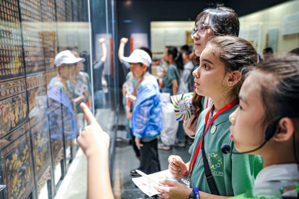 日期:[2024-05-01] 版次:[015] 版名:[特别策划]触摸恐龙蛋化石、走近青铜文明、了解广东历史文化演变史……近200 名中外少年儿童走进广东省博物馆,按照“广东历史文化”“广东自然资源”“青铜文明”“ 工艺艺术”等路线,前往不同的主题区域进行沉浸式探索,通过完成不同的文博体验任务,深入体验中华文化魅力。