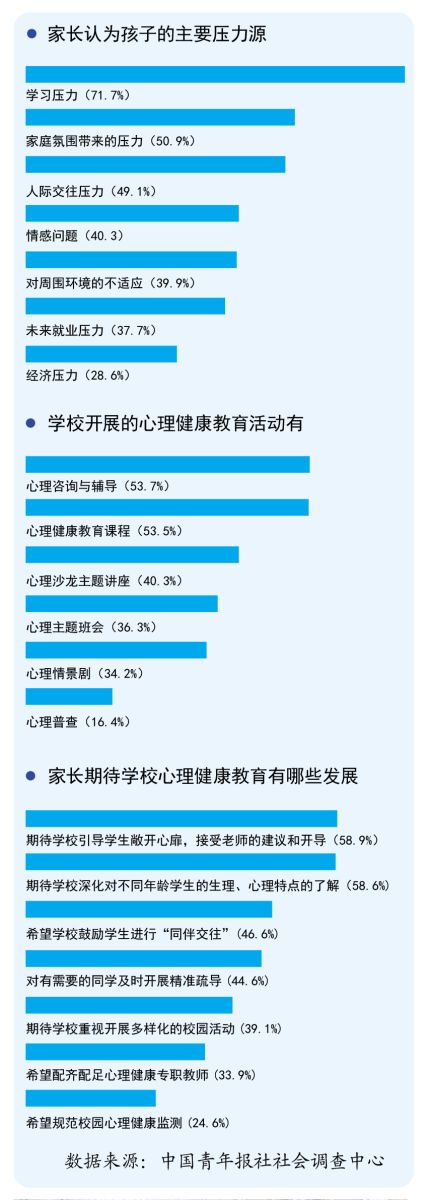 “有一次女儿连着几天闷闷不乐,我问她原因也不回答。后来是班主任主动联系我告知了女儿和同学间发生了矛盾,才一直情绪不佳,在心理老师的开导下,她的情绪也慢慢恢复了。”学生家长高先生十分认同“青少年在生活、学习中面临的压力与其心理健康状况密切相关”这一点,但他也表示,孩子的压力情绪不能不重视,然而成年人与小孩子面临的压力构成并不同,没有学习过心理健康知识的家长难以完全理解青少年的情绪反应指向何处。