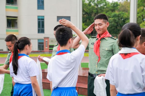 5位边防战士为少先队员们带来了一堂国防教育主题队课,深刻阐述了爱党、爱国、爱人民的重要性,在大家心中播下了红色种子。 战士们还与少先队员们互动交流,耐心且亲切地回答了他们的提问。