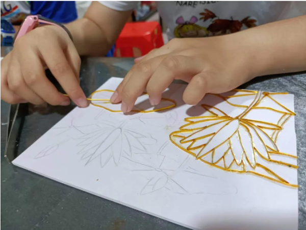 在永庆坊的“广州珐琅制作技艺”工作室里,我体验了制作掐丝珐琅。首先,用铅笔在底板上勾勒出睡莲图案,然后把金丝线捋直,剪成合适的长度,再使用工具将其一点一点弯折,沿着铅笔的痕迹贴在底板上。紧接着,就是将彩砂和固沙胶搅拌融合,用小铲子慢慢将其铺在底板上。在这个过程中要注意少量多次地蘸取彩砂,进行渐变色晕染。待彩砂全部铺好后,就可以拿去照灯封层了。没想到一件小小的掐丝珐琅竟然有这么多的工序,我不禁感叹工匠们制作大件珐琅的恒心与耐力。