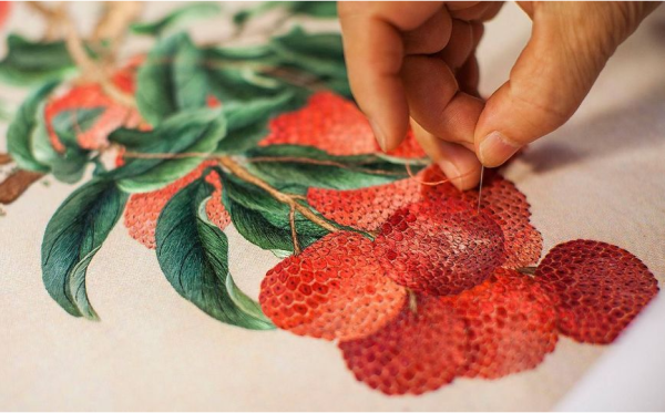 一进入体验厅,五彩斑斓的绣品立刻吸引了我的目光:红如火的木棉,让人垂涎欲滴的荔枝,栩栩如生的鸟儿……每一幅绣品都如此的精美,仿佛一幅幅立体的画作。我被这些色彩绚丽、线条优美的绣品深深吸引,忍不住想要仔细观看。细看之下,我发现这些绣品都蕴含百花齐放、三羊开泰、百鸟争鸣等美好寓意,展现出中国优秀传统文化的独特魅力。