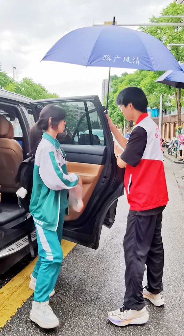 下雨了,志愿者为考生打伞,护送进入考场