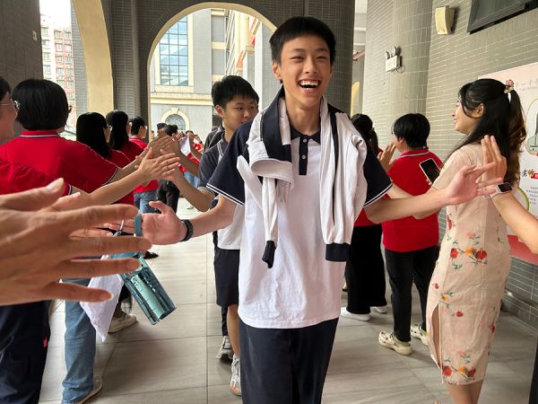 考试首日,广州市第一中学师长与考生击掌鼓劲