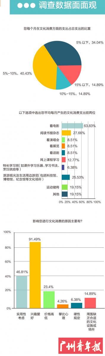 近日,本报发起广州青年文化消费力微调查。调查结果显示,超过六成的人平均每月文化消费支出前两位是看电影,近三成的人选择阅读书报杂志;超过九成的人进行文化消费主要出于兴趣爱好。
