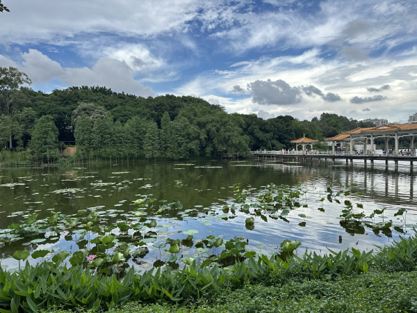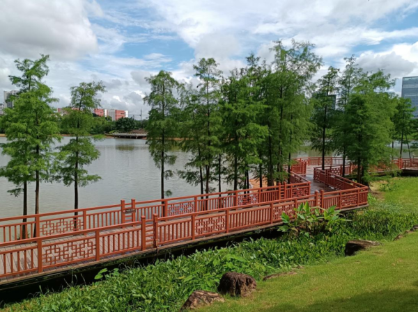 越秀区广东万里碧道旁有个湖水清澈见底的人工湖,白云悠闲地飘过,小鸟在树枝上欢快地歌唱,湖里的水杉参天而立,荷花盛开,小鱼欢快地游动,见此,我不禁举起相机记录下这一派美丽和谐的景象。