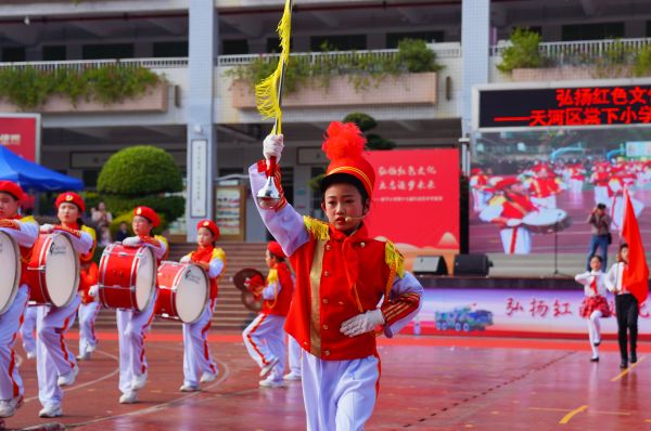 天河区棠下小学先后创建了17个以伟人命名的“英雄中队”,每年10月举行“英雄中队”授旗仪式,倡议全体队员向英雄学习,传承伟人精神。同时,学校还把每年12月定为红色教育月,开展多形式的综合实践活动。
