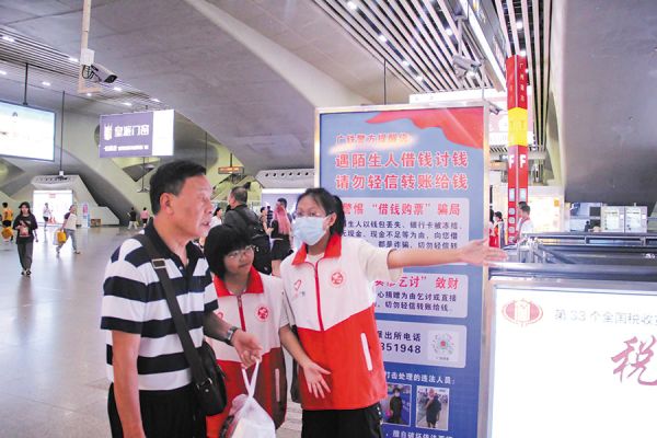 交通指引,安全出行。广州组织中小学生志愿者在客流较大的交通枢纽进行志愿服务,为旅客提供出行咨询和指引,帮助旅客节省出行时间,持续传递温情和温暖。