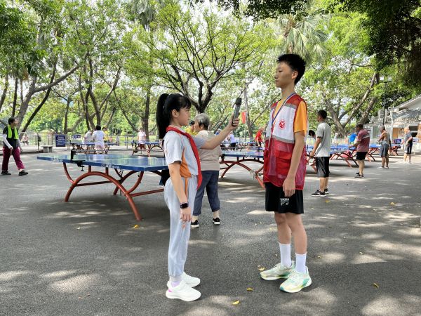 这天,我在流花公园的乒乓球场遇到了志愿者白兆轩和潘梓翘。他们是初中生,利用暑假参加志愿服务。平常,他们负责乒乓球场的路线指引、安全提示、清理垃圾等工作,有时,还会陪来此锻炼的老年人打上几盘乒乓球。别看他们年轻,却不一定能打赢年迈的爷爷奶奶。“运动真的可以让人越活越年轻,这在打球的老年人身上体现得淋漓尽致。我们正在做推动营造全民运动氛围的志愿服务,很有意义!”白兆轩和潘梓翘笑着说。