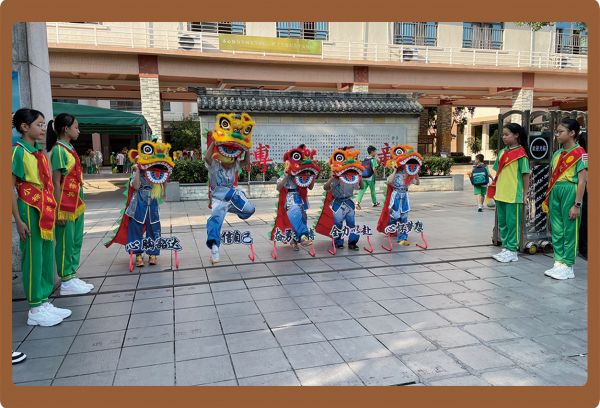 一支威风凛凛的醒狮小队出现在广州市番禺区南村镇南华小学的校门前,为同学们鼓劲加油。同学们纷纷跃起,跨过门口象征着挑战与梦想的跨栏,突破自我,向着更高的目标迈进。开学典礼上的国风舞蹈、中华武术等表演更是充分体现了学校博古开新、传承中华优秀文化的理念,饱含对同学们的美好祝愿。