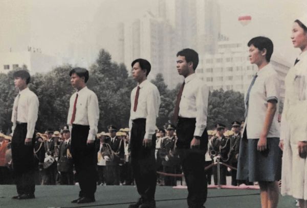 1996年的“广州成人宣誓日”,近万名18岁青年齐聚广州天河体育中心参加成人宣誓活动。此前,60名优秀青年代表专程前往位于北京的国旗护卫队基地,将曾飘扬在天安门广场上的国旗迎接回广州。彼时是广州市第二中学学生的胡珊正是这60名优秀青年之一。