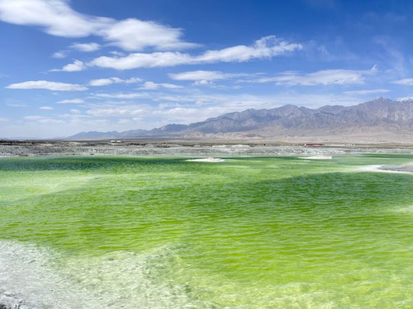 大柴旦翡翠湖位于青海省海西蒙古族藏族自治州。湖内富含不同浓度的钾、镁、锂等多种元素,因此,这个湖能够呈现出不同的颜色,可漂亮了!透过水面,还能清晰地看到湖底的盐层。同学们有机会也不妨来这里游览一番吧!