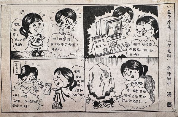 于是,我小心翼翼地找出珍藏多年的剪报,一页页地翻着,看着那些早已发黄但依然生动鲜活的四格漫画小故事,满满的青春回忆也瞬间涌上心头。1994年,第一期《小盈子外传》漫画专栏伴随着“新绿校园”的创刊出版了。当时我还是个爱看漫画、画漫画的初中女孩。虽然平时学业也很紧张,但画漫画成为了我舒缓学习压力一种方式。从开始的每月一期到后来的每周一期,我把同龄人的思想,学习和生活都融入到“小盈子”的故事里。在豆腐块大的四格中,有青春期的离经叛道,有少年人的奋发向上,也有成长中的酸甜苦辣。