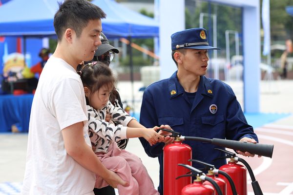 亲子齐上阵在消防队员指引下学习灭火器用法