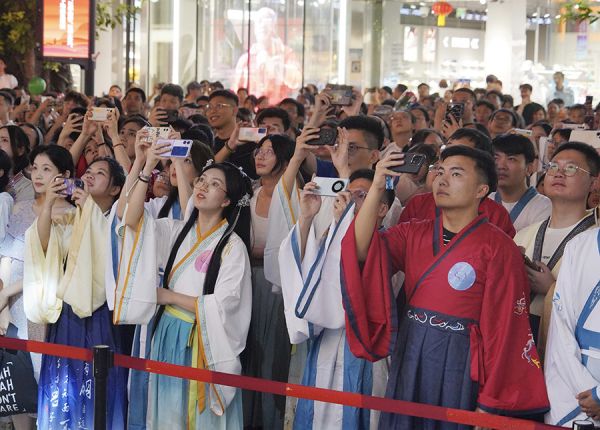 七夕佳节,单身青年换装汉服观赏广州青宫橱窗剧场