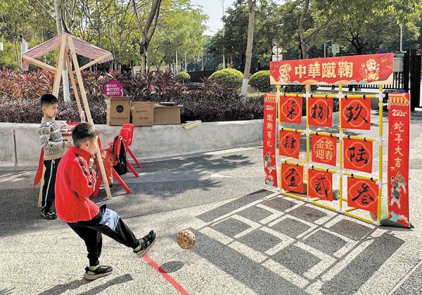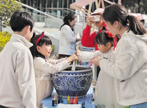 在传统文化体验区,红包DIY、挥毫写福等传统民俗活动备受欢迎,家长带着孩子一起体验滚轮章、拓印,再加上自己DIY的吉祥纹样,制作出一份独一无二的红包;市少年宫师生和国家一级美术师、黄埔区书法家协会副主席陈育等书法家一起挥毫泼墨、起笔运腕,写下对新年的美好祝福;玩转飞花令项目带领参与者们在诗词的海洋中畅游,感受传统文化的博大精深;家长和孩子们亲手制作植物书签,将自然的美好留存;参与者们还体验了“蹴鞠”这一古老的体育运动项目,点燃运动激情。
