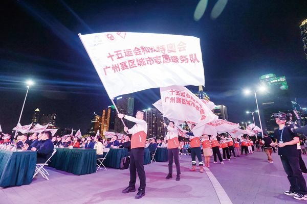在雷鸣般的掌声中,24支十五运会和残特奥会广州赛区城市志愿服务队接过象征使命的志愿服务队旗,标志着十五运会和残特奥会广州赛区新彩广州全民志愿行动正式落地运行。