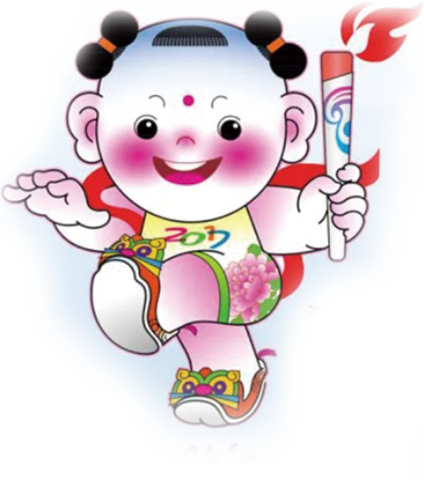 2017年8月,第十三届全运会在天津举办。吉祥物“津娃”的样子来自天津杨柳青板年画。“津娃”举着全运火炬,火苗是“13”的形状,告诉大家这是第十三届全运会。它穿着虎头鞋,拿着红绸带,蹦蹦跳跳超可爱!