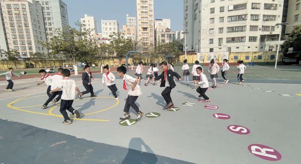 在遂溪县遂城第九小学操场,一场以“阳光体育好习惯”为主题的大课间活动正在如火如荼地进行。真人飞机棋、跳房子、冲关大挑战、手脚并用、十字跳等传统游戏经过创新,吸引着孩子们在游玩中体验体育的独特魅力。活力四溢的校园内,孩子们随着有节奏的音乐跑、跳、追逐游戏。