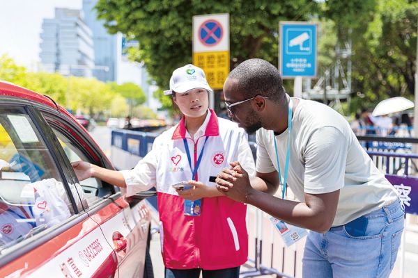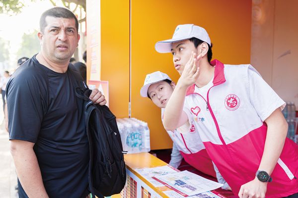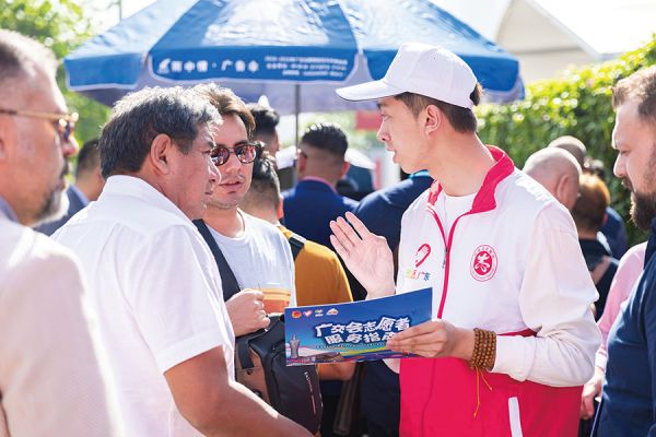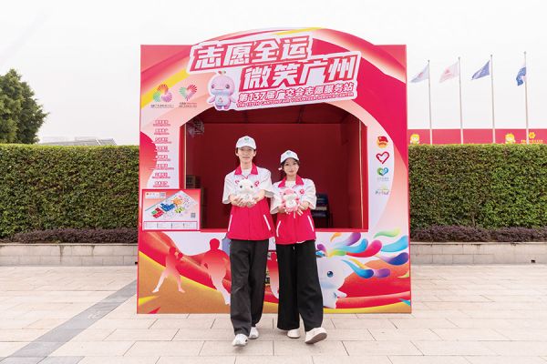志愿者以广交会展馆周边的4个“微笑广州,志愿全运”主题志愿服务驿站为据点,为国内外客商提供全方位志愿服务。志愿驿站不仅在外观设计上融合了十五运会和残特奥会元素,还会开展全运会相关运动项目的快闪活动,传递全运会的激情活力。