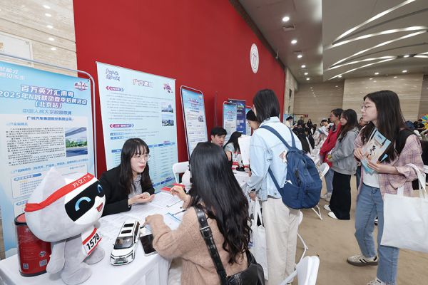 4月20日,“百万英才汇南粤”2025年N城联动春季招聘活动(北京站)——人民大学校园专场在中国人民大学世纪馆北大厅举办,该活动由团广州市委、市青联、市青企协、市青基会联合天河区、荔湾区、广州日报、广州电视台、中国人民大学广州校友会等单位举办,现场还设置了广府文化、科技创新以及十五运会和残特奥会等多种特色文创产品,帮助人大学子直观感受广州城市魅力。